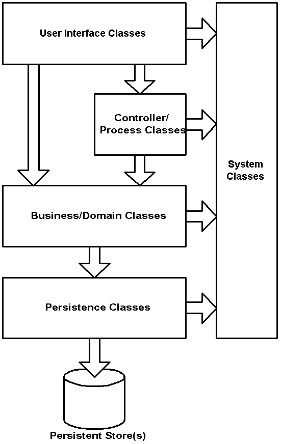 Figure 1 depicts a five-layer class-type architecture for the design of object-oriented software. As the name suggests, a user interface (UI) class implements a major UI element of your system. The business behavior of your system is implemented by two layers: business/domain classes and controller/process classes. Business/domain classes implement the concepts pertinent to your business domain such as “student” or “seminar,” focusing on the data aspects of the business objects, plus behaviors specific to individual objects. Controller/process classes, on the other hand, implement business logic that involves collaborating with several business/domain classes or even other controller/process classes. Persistence classes encapsulate the capability to store, retrieve, and delete objects permanently without revealing details of the underlying storage technology. Finally, system classes provide operating-system-specific functionality for your applications, isolating your software from the operating system (OS) by wrapping OS-specific features, increasing the portability of your application.